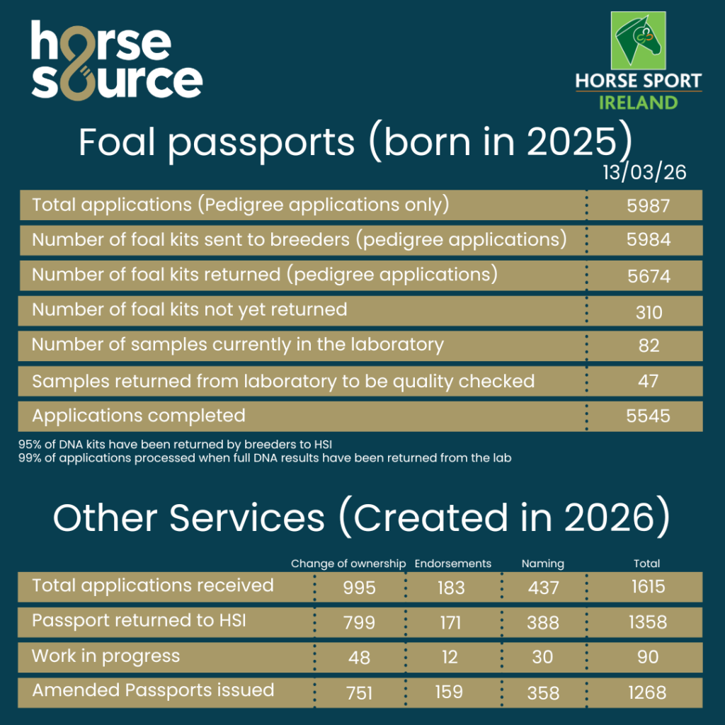 Of the 5674 applications who have returned their foal kits to HSI, 5545 have been completed and the passport issued, and 47 are currently undergoing quality control checks, while the remaining 82 applications’ DNA samples are currently with the laboratory for analysis.