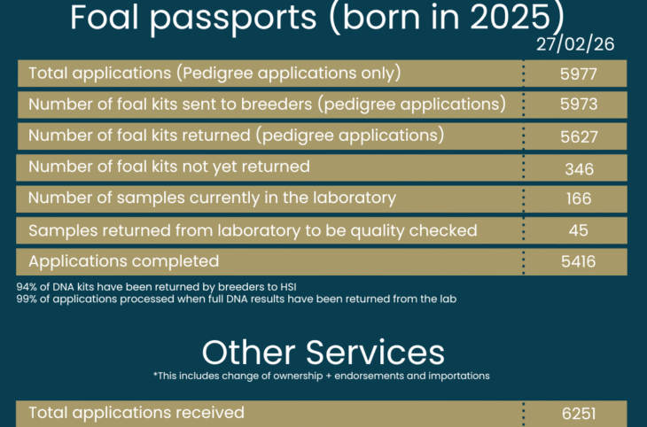 HSI has received 5977 applications and issued 5416 completed applications for foals born in 2025. 5973 pedigree applications have had…