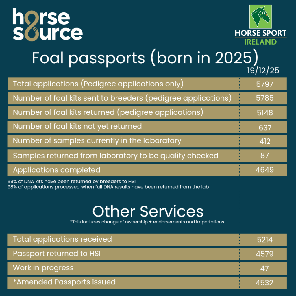 Of the 5148 applications who have returned their foal kits to HSI, 4649 have been completed and the passport issued, and 87 are currently undergoing quality control checks, while the remaining 412 applications’ DNA samples are currently with the laboratory for analysis.