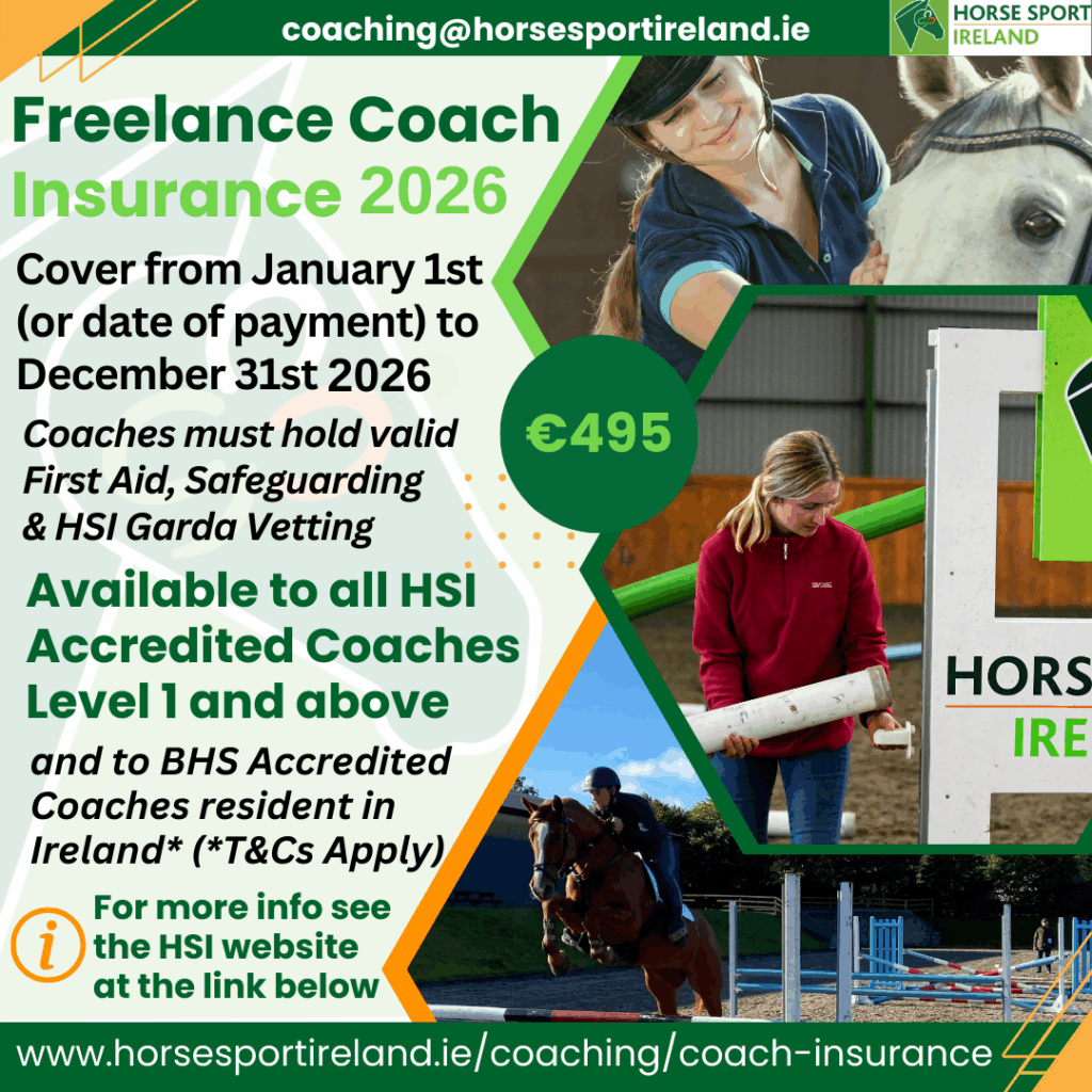 The 2026 HSI Freelance Coach Insurance Policy is open to all HSI Coaches who have completed the HSI Level 1 Apprentice Coach course and above. As of 2022 the policy is open to British Horse Society (BHS) Accredited Coaches who are resident in Ireland. In order to avail of the policy BHS coaches must have a minimum qualification of BHS Stage 3 in Complete Horsemanship or UKCC Level 2 plus BHS Stage 3 Care and Ride.