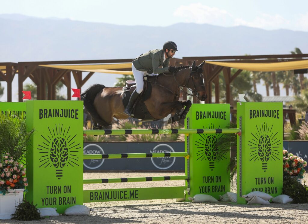James Chawke and Daido van’t Ruytershof Z (below) can always be relied upon to put their best foot forward in a jump-off, and the Portlaoise native and his 12-year-old mare made light of being pathfinder for a 45-strong field to beat off fellow Irishman, Conor Swail not once but twice, and lead an all Green Jacketed podium in Thursday’s 1.45m Welcome Speed at the three-star show in Thermal, California.