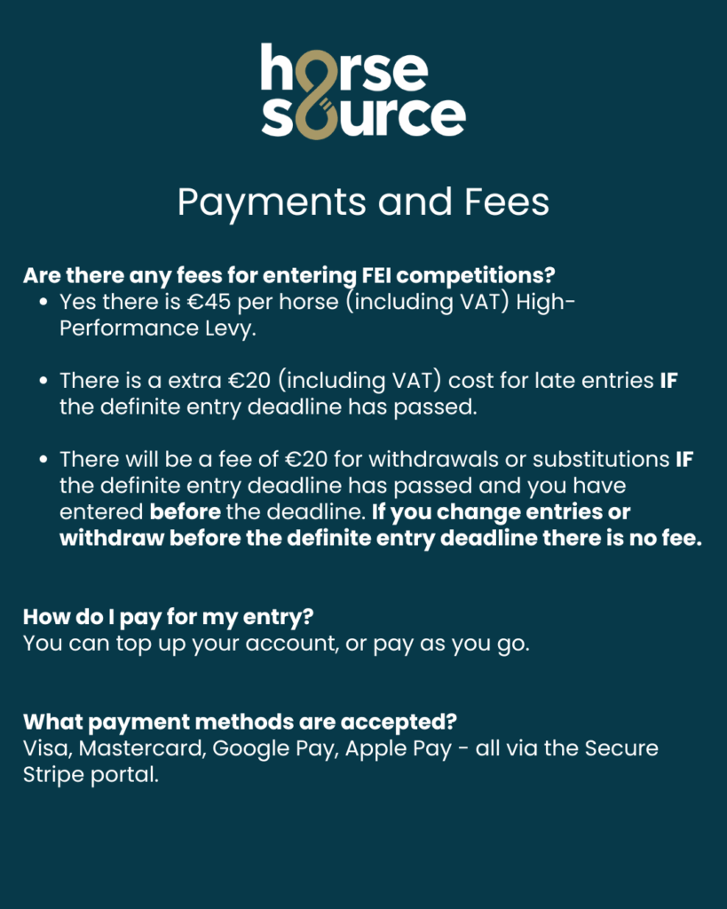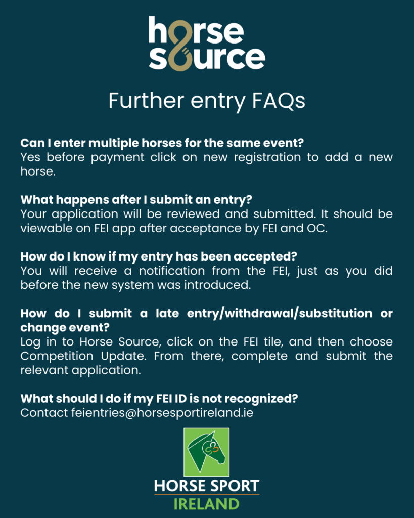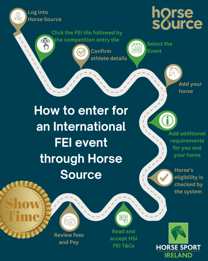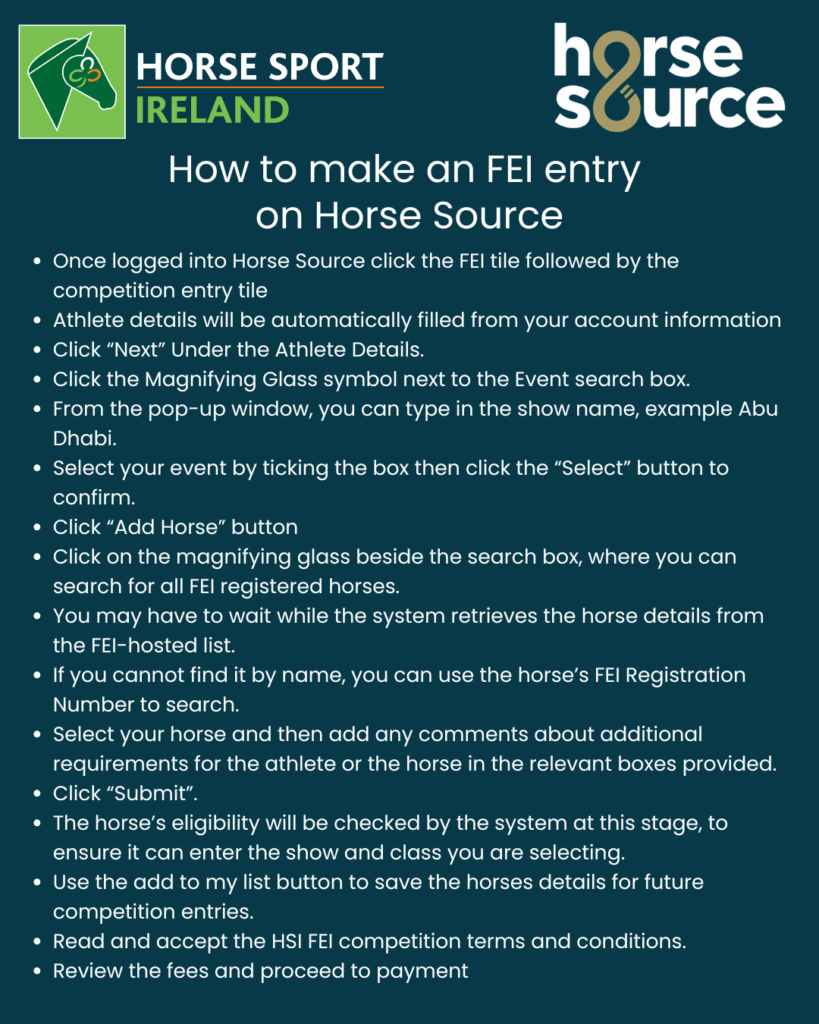 Please find, below, a user guide on how to get started on Horse Source with your athlete account and how to enter an FEI international event through Horse Source.