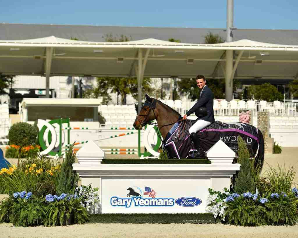 Just a few hours later, on Sunday morning Irish time in Ocala, it was Daniel Coyle winning the $200,000 Gary Yeomans Ford Grand Prix from a world-class field, with a horse at the opposite end of the experience spectrum, 16-year-old Farrel (below).