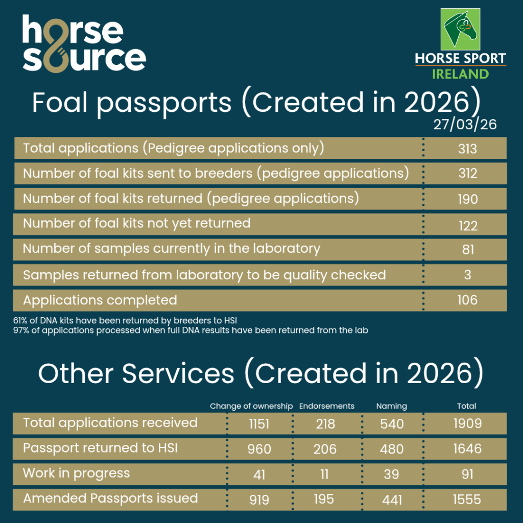 Of the 190 applications who have returned their foal kits to HSI, 106 have been completed and the passport issued, and three are currently undergoing quality control checks, while the remaining 81 applications’ DNA samples are currently with the laboratory for analysis.